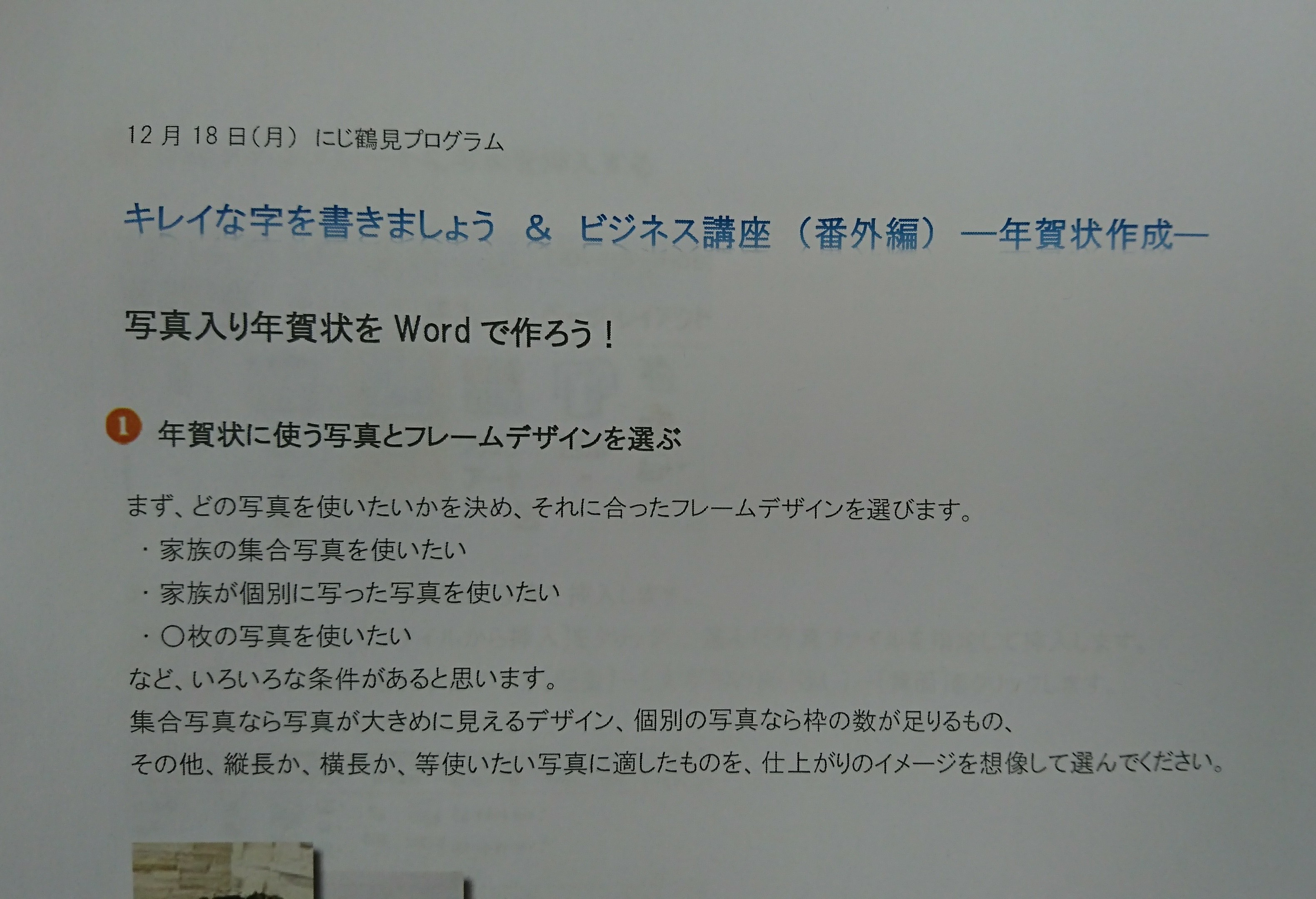 鶴見12/18年賀状作成プログラム 今日は、手書きではなく、パソコンを使って、年賀状を作成するプログラムを行いました。 年賀状といっても、最近では色んな作成の仕方がありますが、 今回は、Wordを使用して作成しました。 ダウンロードした年賀状用の写真テンプレートに、 「犬」と「梅の花」と「富士山」の3枚の画像を入れたり、宛名面もWordで作りました。 今日参加された皆さんは、特にパソコンを使い慣れていらっしゃる方が多かったので、 とてもスムーズに進み、プログラムが予定よりも大幅に早く終了してしまいました! 年賀はがきの受付締切日の25日まで、あと1週間! 皆さんも、工夫を凝らした年賀状を作ってみてはいかがでしょうか。 この投稿へのコメント コメントはありません。 コメントを残す コメントをキャンセル メールアドレスが公開されることはありません。 * が付いている欄は必須項目ですコメント 名前 * メール * サイト 次回のコメントで使用するためブラウザーに自分の名前、メールアドレス、サイトを保存する。 この投稿へのトラックバック トラックバックはありません。 トラックバック URL