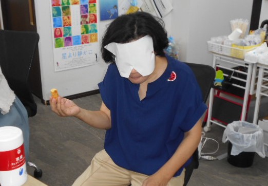 まず、利きうまい棒は、目隠しをし、味覚だけを頼りにうまい棒の味を当てます。
