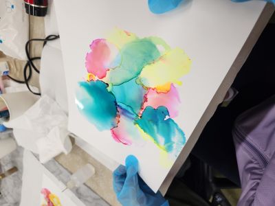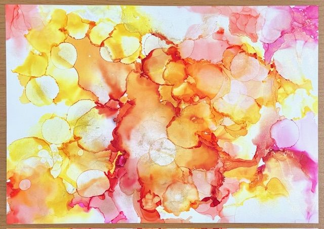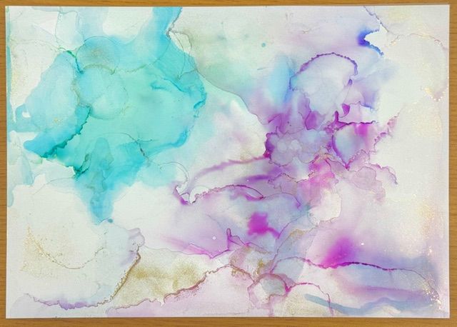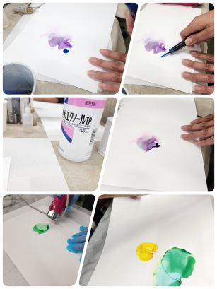 紙の上にアルコールインクを垂らし、インクの広がりやにじみ、色の混ざり合いから偶然できる模様を楽しむアートです。